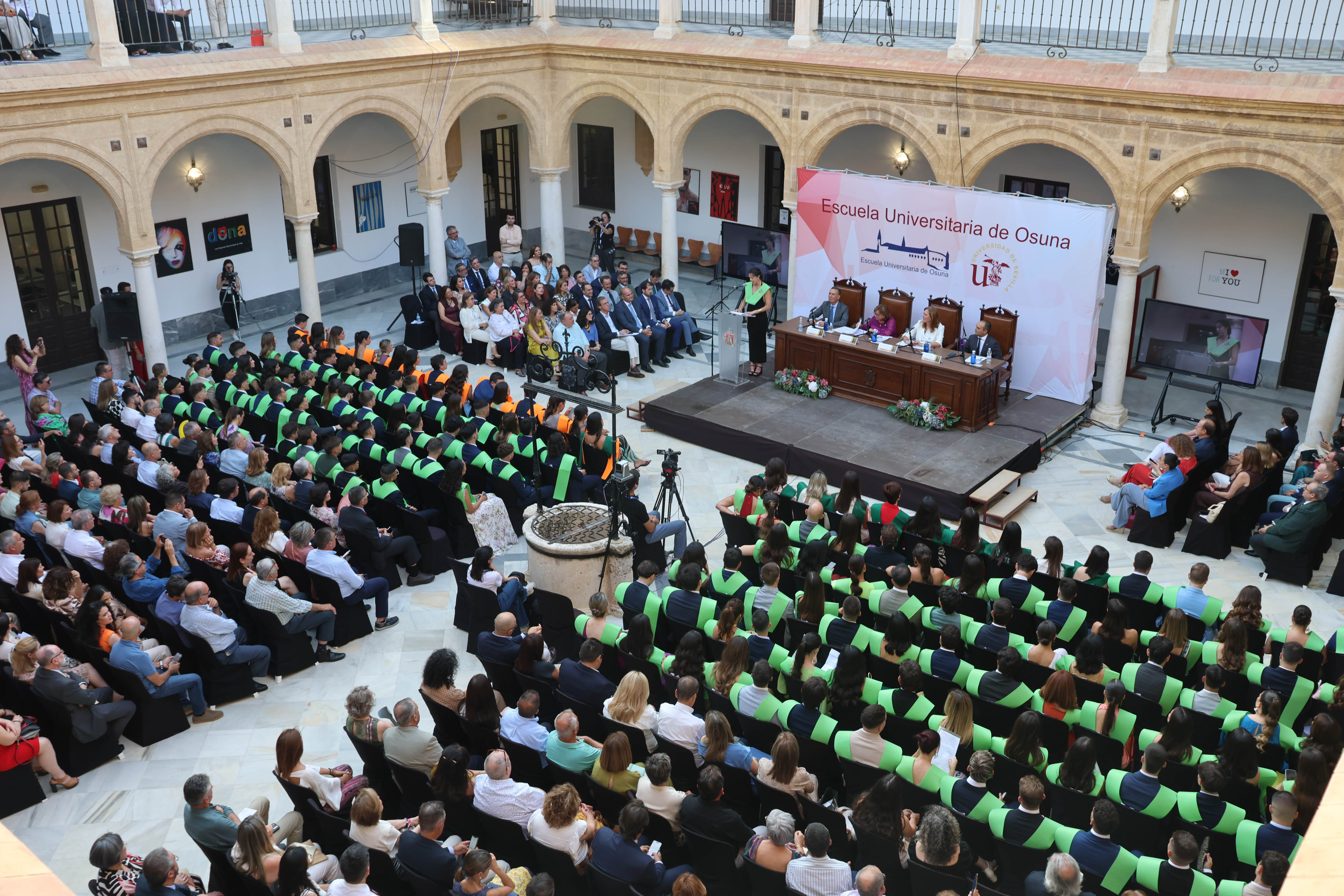 El claustro de la Antigua Universidad acogió ayer jueves, 12 de junio, la primera de las dos sesiones del acto de graduación del alumnado de la promoción 2021-2025. Dicho acto estuvo presidido por la alcaldesa de Osuna y presidenta de la Fundación Pública de Estudios Universitarios Francisco Maldonado, Rosario Andújar, y la vicerrectora de estudiantes de la Universidad de Sevilla, Mª Carmen Gallardo, quienes estuvieron acompañadas por el delegado municipal de universidad y vicepresidente de la fundación, Jesús Heredia, y el director gerente de la misma, Carlos Chavarría.
