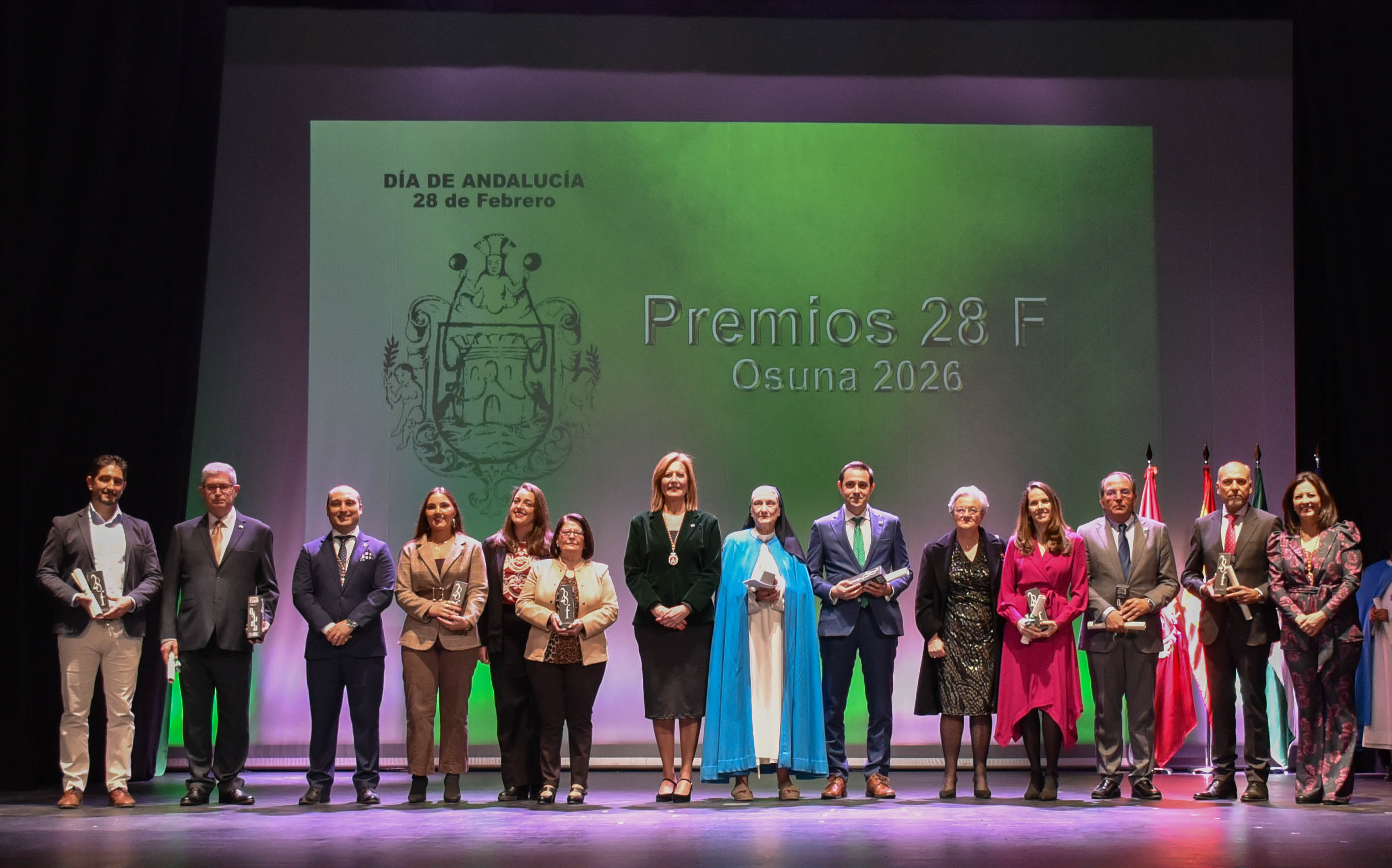 El Ayuntamiento de Osuna ha celebrado en el Teatro Municipal Álvarez Quintero la decimoséptima edición de los Premios 28 de febrero con motivo del Día de Andalucía, en un acto institucional que ha convertido esta fecha en un espacio de encuentro, memoria colectiva y reconocimiento público a quienes han engrandecido el nombre de la localidad.