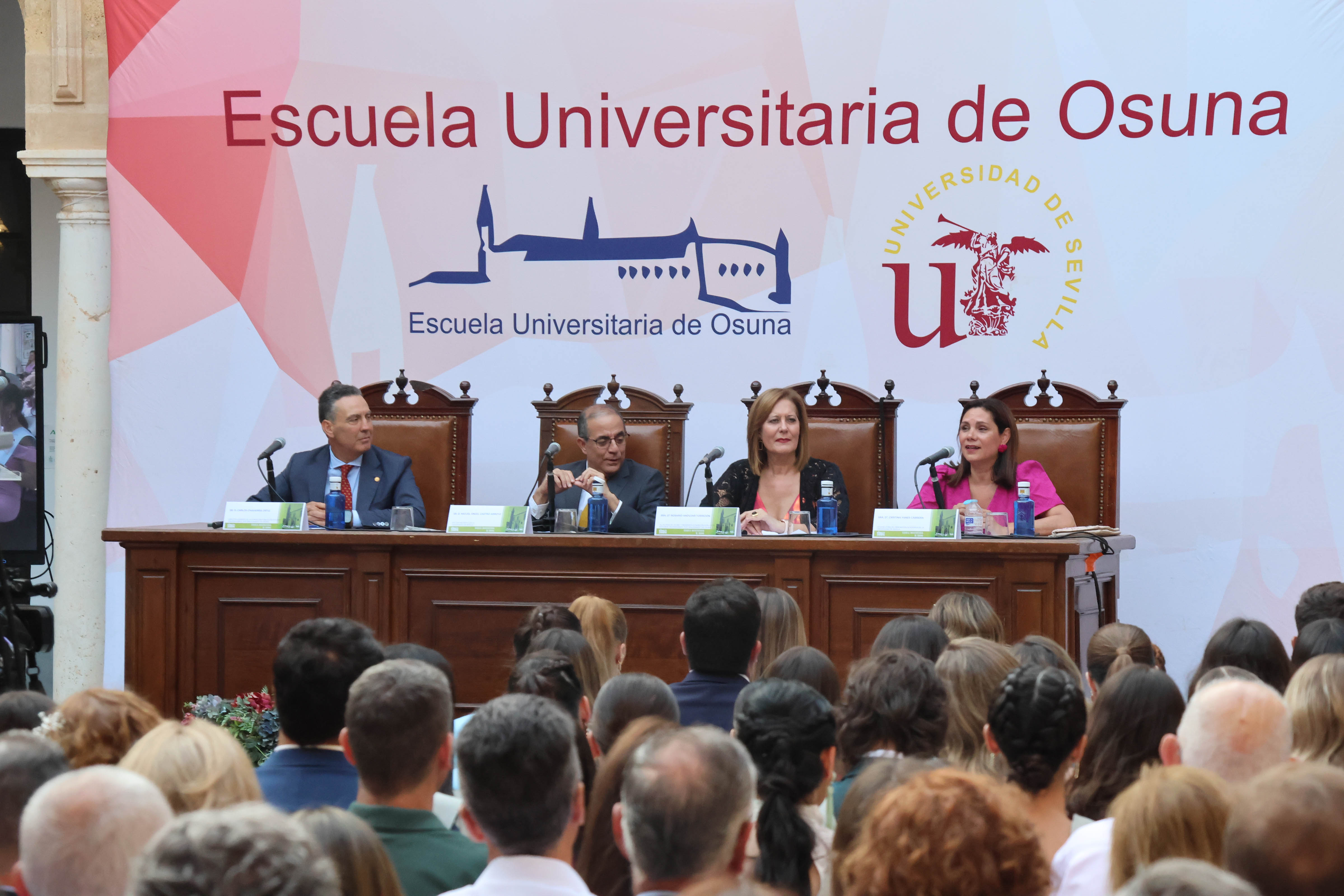 La alcaldesa de Osuna y presidenta de la Fundación Pública de Estudios Universitarios Francisco Maldonado, Rosario Andújar, y el rector magnífico de la Universidad de Sevilla, Miguel Ángel Castro, presidieron la segunda sesión del acto de graduación del alumnado de la promoción 2021-2025. Celebrado en el claustro de la Antigua Universidad, aquí estuvieron acompañados por la vicerrectora de Ordenación Académica de la Universidad de Sevilla, Cristina Yanes, y el director gerente de la Escuela Universitaria de Osuna, Carlos Chavarría.