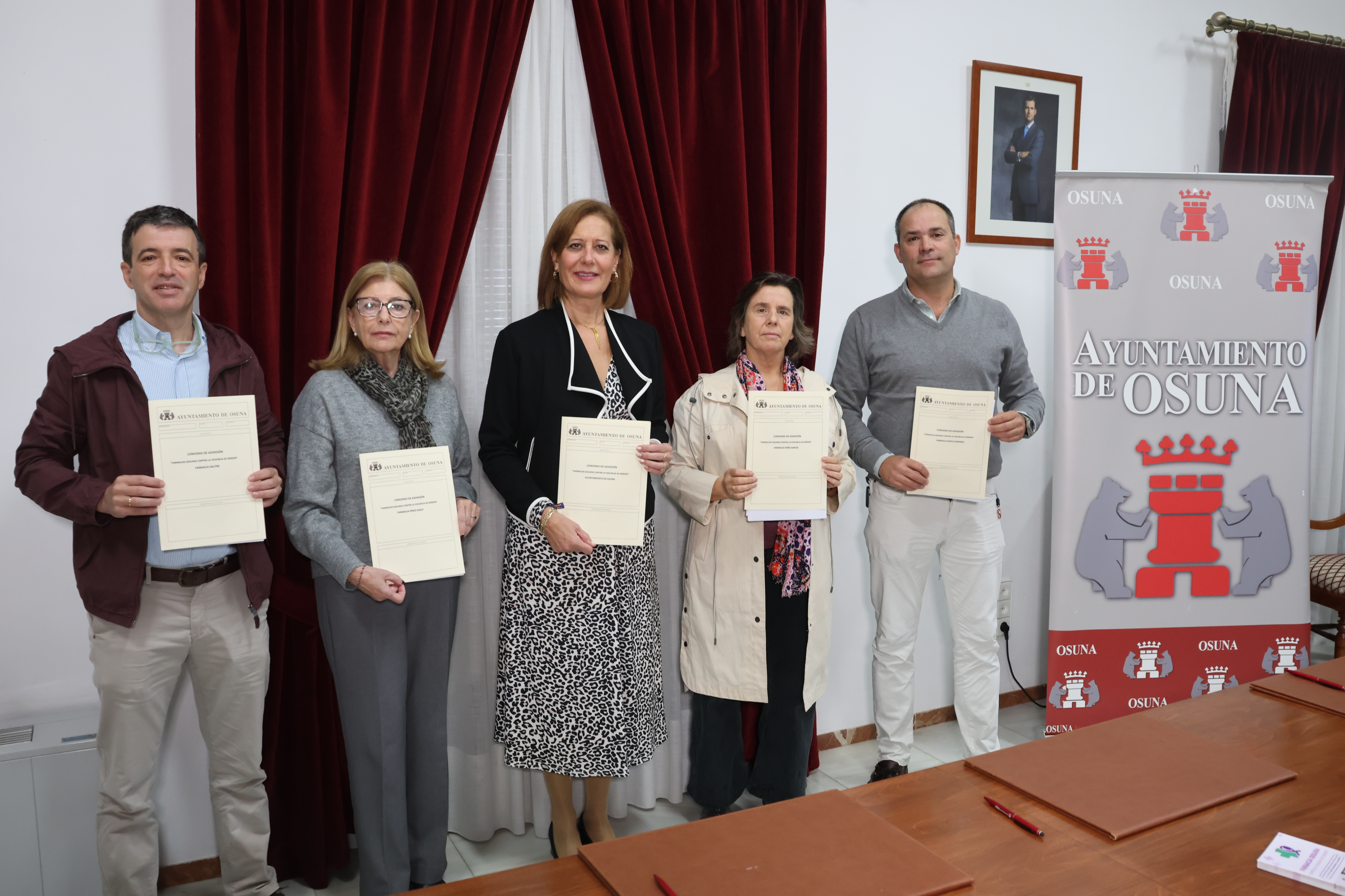 La alcaldesa de Osuna, Rosario Andújar, ha firmado con representantes de las farmacias Salitre, Pérez Gago, Peña García y Santo Domingo un convenio pionero en nuestra localidad e impulsado por el Ayuntamiento, que tiene como objetivo ofrecer una respuesta rápida, segura y empática ante cualquier indicio o manifestación de violencia hacia las mujeres, a través de un Protocolo de Actuación en Farmacias.