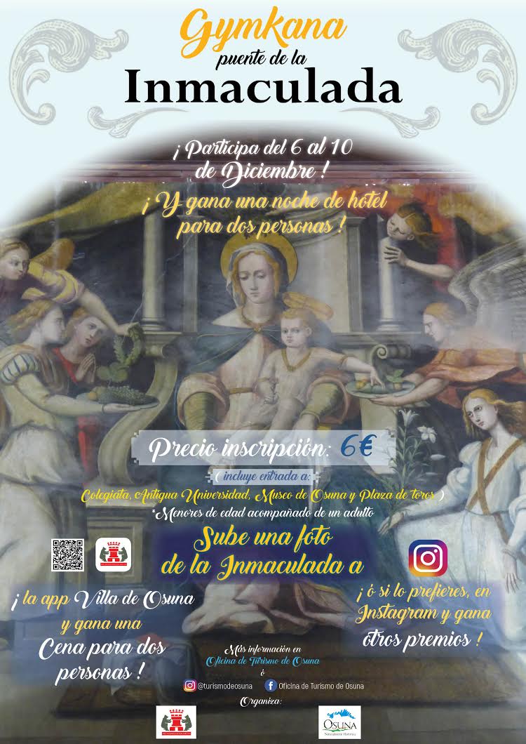 Se trata de una original gymkana turística, en la que tanto locales como visitantes podrán participar del 6 al 10 de diciembre buscando por los espacios monumentales de la ciudad las imágenes de la Virgen Inmaculada, cuya presencia es notoria en Osuna por la devoción hacia ella del Duque de Osuna y IV Conde de Ureña. Todos los participantes que superen las pruebas de esta gymkana entrarán en un sorteo y optarán a una noche de hotel.