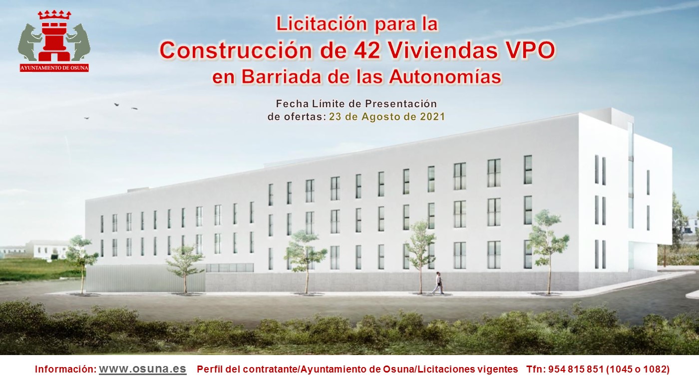El Ayuntamiento de Osuna informa que se abre el plazo de licitación de las obras de 42 viviendas de VPO que se construirán en un solar conocido como PR-6, cerca de la barriada de las Autonomías. Este plazo estará abierto hasta el próximo 23 de agosto, para todas aquellas empresas que quieran concurrir.