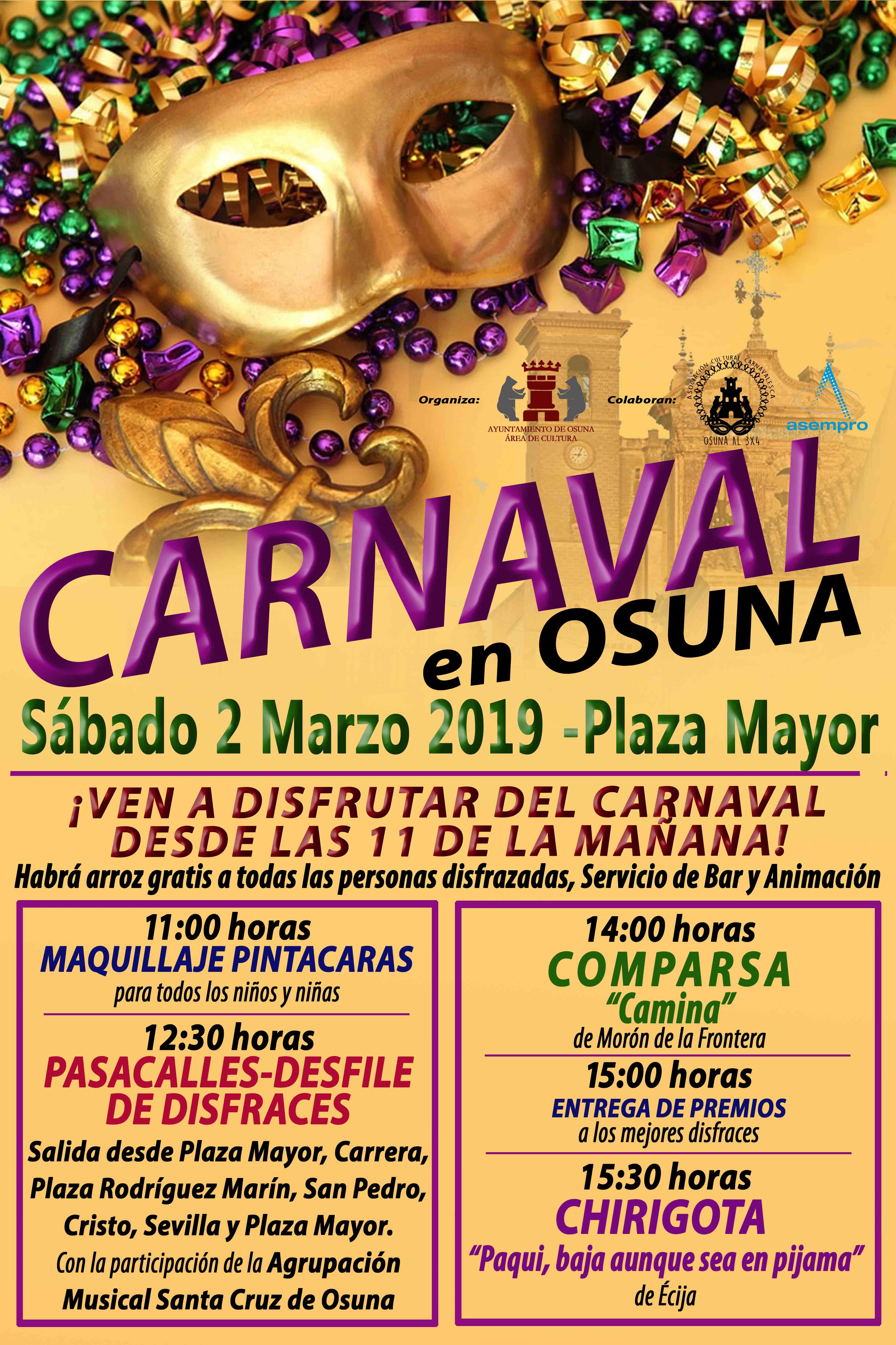 Un año más, el sábado, 2 de marzo el carnaval será el protagonista por las calles de Osuna. Y este año presenta cambios importantes, porque no viviremos una tarde, sino un día completo de carnaval, que dará comienzo a las 11 de la mañana, para que, todos los pequeños y mayores que se quieran maquillar, pasen por el taller de pintacaras que estará situado en la Plaza Mayor.