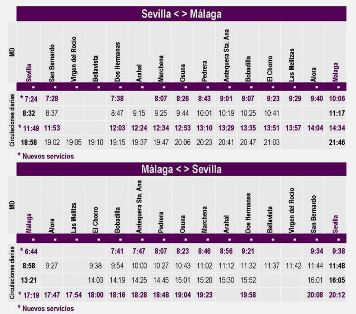 Con el restablecimiento de la infraestructura, Renfe recupera cuatro frecuencias, dos por sentido, llegando a 8 servicios diarios entre Málaga y Sevilla. Los nuevos trenes se ponen ahora en servicio tienen salida de Sevilla a las 7.24h y 11.49h; y de Málaga a las 6.44h y 17.19h. Con esta recuperación, se restablece el 80 por ciento de las conexiones diarias por vía convencional entre ambas capitales respecto a la oferta existente antes de la crisis sanitaria.