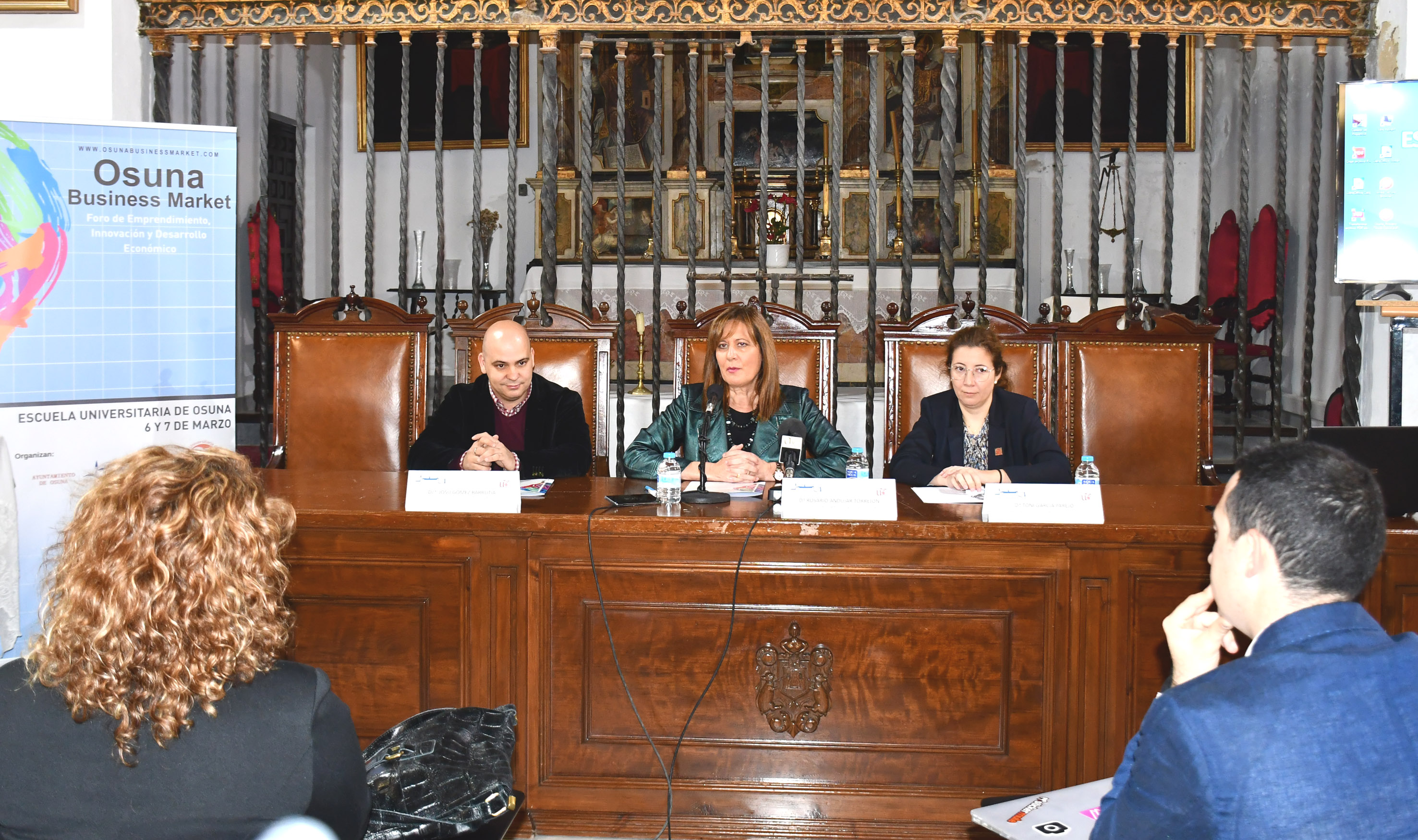 La alcaldesa de Osuna, y presidenta de la Fundación Pública de Estudios Universitarios, Rosario Andújar, ha asistido hoy a la apertura del I Foro Osuna Business Market, acompañada por el coordinador del mismo Josu González, y por la directora de la escuela universitaria, Toñi García.