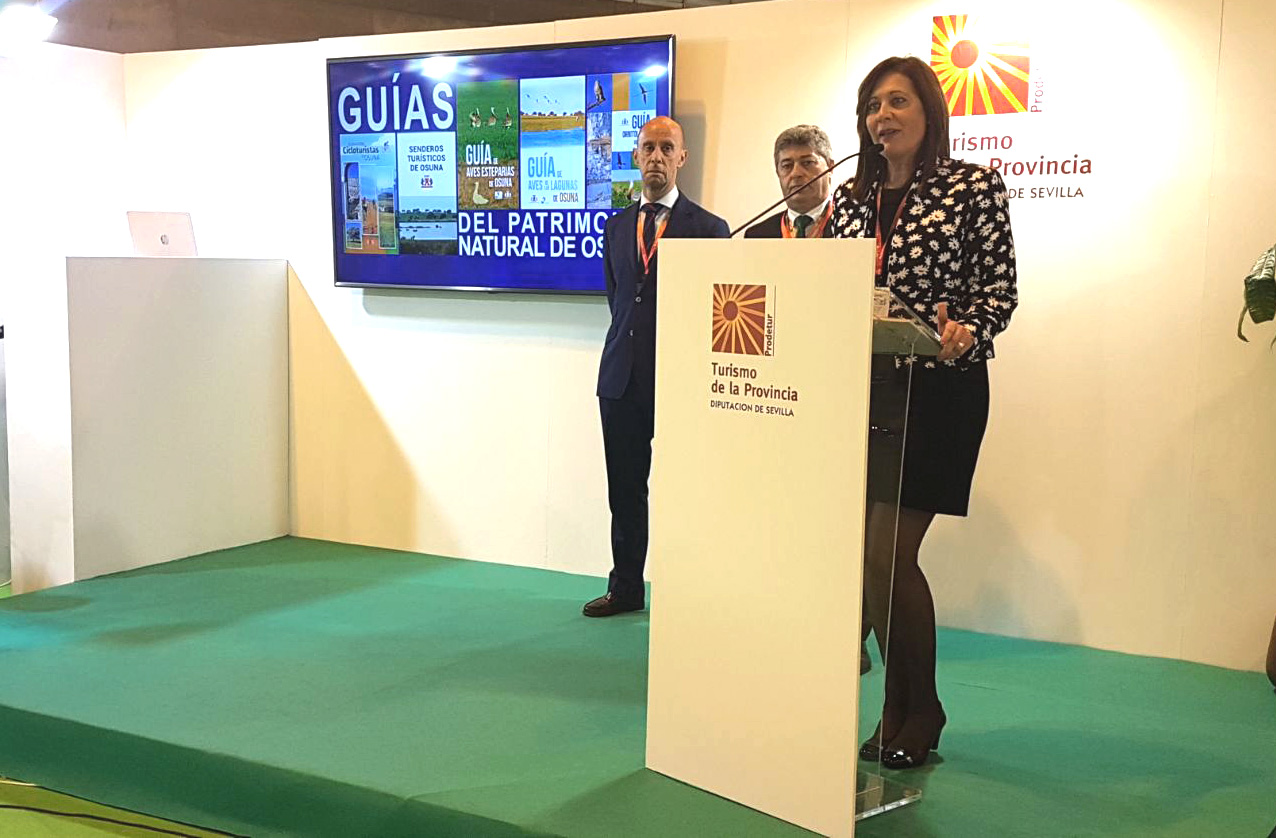 En la mañana de hoy viernes, 19 de enero, la alcaldesa de Osuna, Rosario Andújar, ha presentado en el stand de Sevilla del pabellón de Andalucía, en la Feria Internacional de Turismo (Fitur), que se celebra esta semana en Madrid, las nuevas Guías del Patrimonio Natural de Osuna que se han diseñado y editado, y que recogen completa información sobre ornitología, aves esteparias y el complejo endorreico de las lagunas, así rutas cicloturísticas y senderos turísticos del término municipal.”