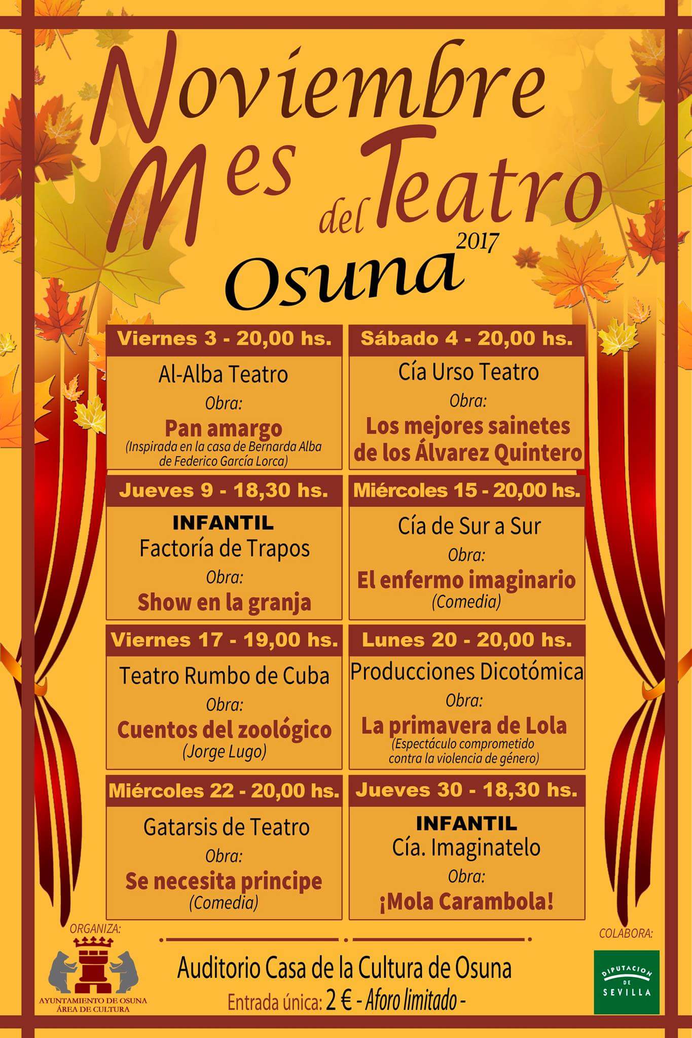 La Delegación Municipal de Cultura del Ayuntamiento de Osuna dedica este mes de noviembre al teatro. Una interesante apuesta cultural por las artes escénicas con una completa programación y variada temática y estilos. Un total de ocho representaciones, la primera de las cuales tuvo lugar el pasado 3 de noviembre con la obra “Pan amargo”, que puso en escena la Compañía “Al Alba Teatro”.