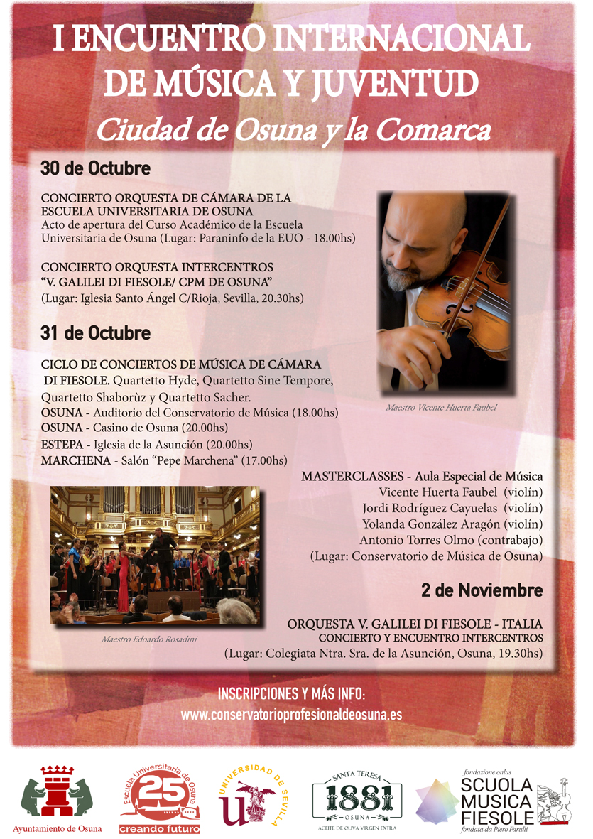 Es precisamente con esta prestigiosa y reconocida Scuola di Musica di Fiesole italiana, comprometida con una educación musical de calidad que ha formado a grandes músicos del panorama actual europeo, con la que el Conservatorio Profesional Municipal de Osuna va a desarrollar  un completo programa que comenzará el martes, 30 de octubre, en el Paraninfo de la Escuela Universitaria de Osuna a las 18.00 horas, con un concierto de la Orquesta de Cámara de este centro universitario.