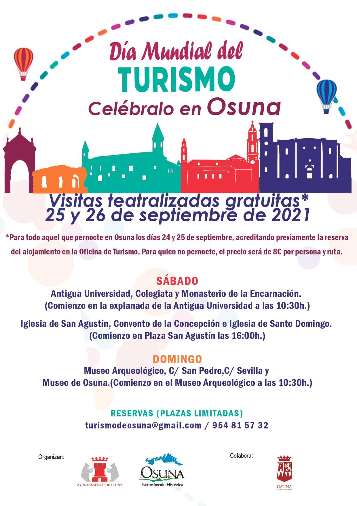 Las rutas teatralizadas serán gratuitas para todas aquellos visitantes que acrediten estar pernoctando en Osuna en estos días, debiendo hacer reserva previa enviando un email a turismoosuna@gmail.com o llamando al número de teléfono 954 815 732. Todas aquellas personas que no pernocten y quieran participar también podrán hacerlo, realizando la reserva previa y abonando ocho euros por persona y ruta.