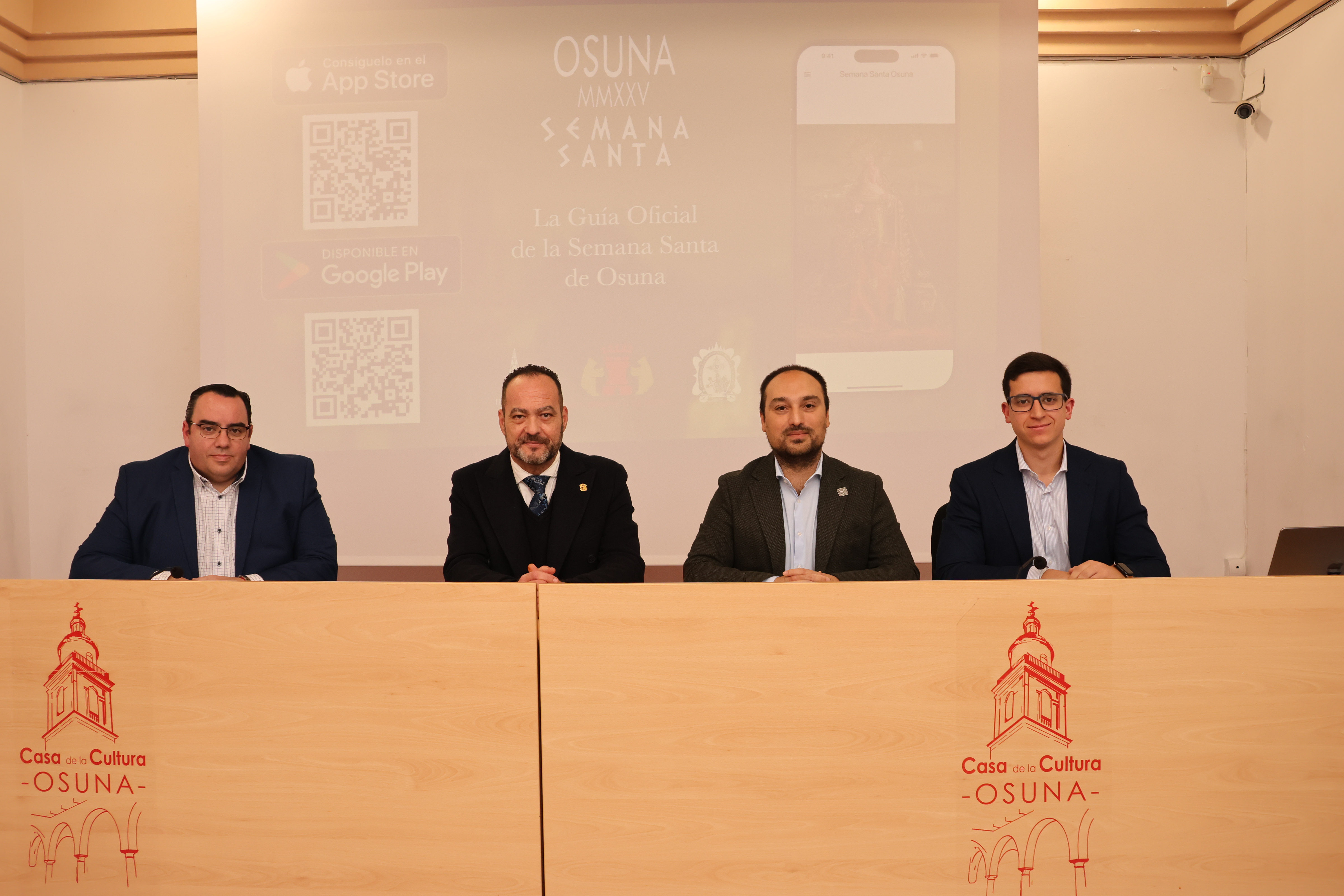 El delegado municipal de Cultura y Festejos, Jesús Heredia, ha presentado junto al presidente del Consejo General de Hermandades y Cofradías de la Villa de Osuna, David Vázquez y los miembros del medio cofrade El Estandarte, José Manuel Navarro y Antonio González, la guía y la aplicación móvil para la Semana Santa 2025.