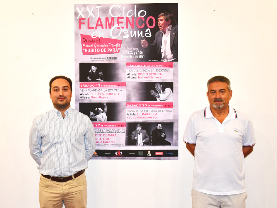 La Casa de la Cultura, acogerá el baile de Eli Parrilla y su cuadro flamenco el sábado 20 de noviembre. Y por último, el Paraninfo de la Escuela Universitaria de Osuna, acogerá la última cita, el sábado 27 de noviembre, donde “Rubito de Pará”, recibirá la insignia de oro de la Peña Flamenca La Siguiriya, tras realizar su espectáculo flamenco junto a su hijo, contando para esta ocasión con Antonio Cáceres a la guitarra.