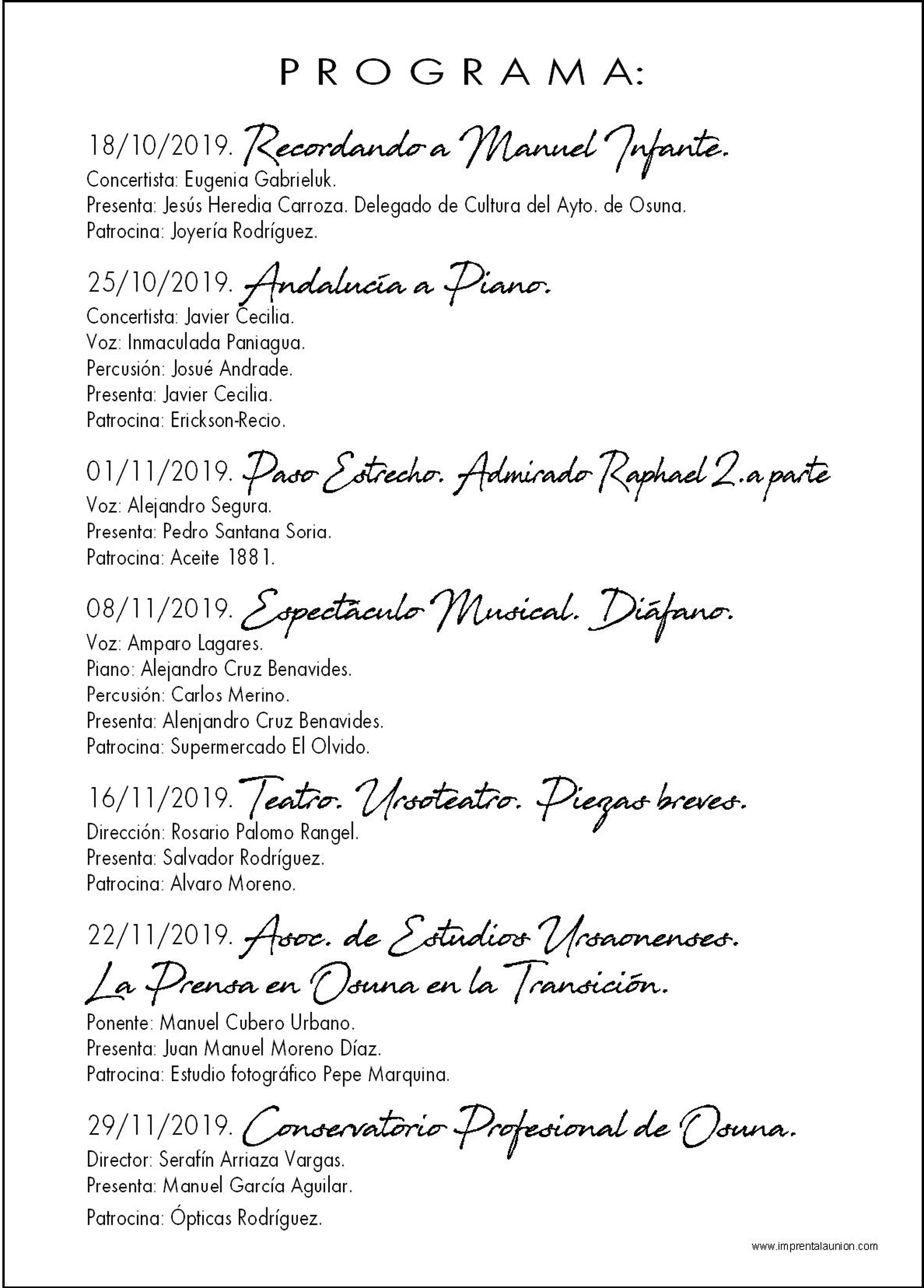 Los actos comenzaran el viernes 18 de octubre, con el acto ‘Recordando a Manuel Infante’, músico nacido en Osuna que llegó a dirigir la Ópera de París. La calle Juan de Vera, lugar donde nació, acogerá el descubrimiento de un azulejo por parte del delegado municipal de Cultura del Ayuntamiento de Osuna, Jesús Heredia. Posteriormente, la concertista rusa Eugenia Gabrieluk, ofrecerá un concierto a piano, con piezas de Manuel Infante en el salón de actos del Casino.