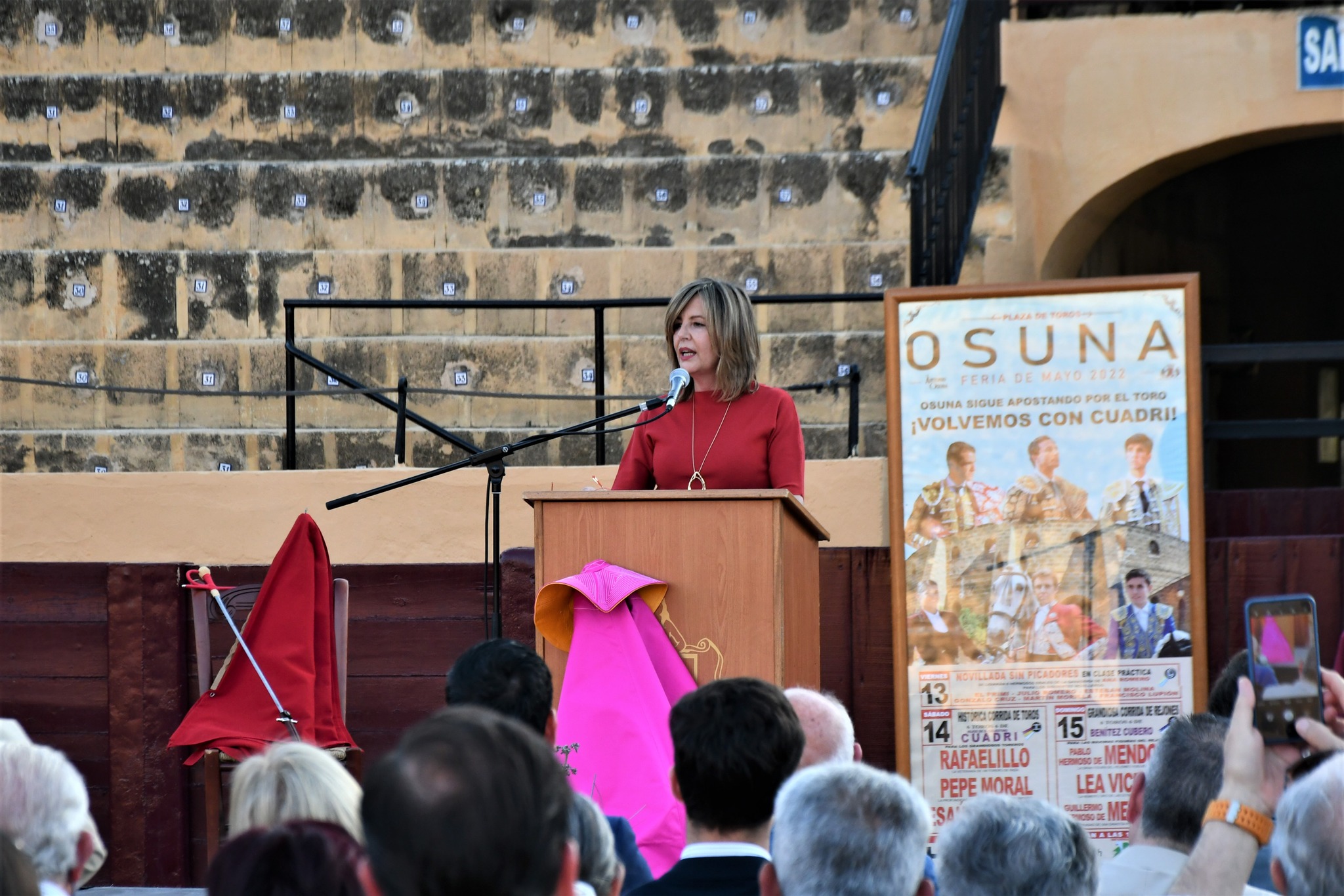 En la tarde noche del pasado sábado, 7 de mayo, Reyes Vargas, alzaba su voz en el coso de nuestra Plaza de Toros para recitar el XIX Pregón Taurinoa de Osuna, en un acto en el que estuvo presente la alcaldesa de Osuna, Rosario Andújar, junto al delegado municipal de Festejos, Manuel Rodríguez, acompañados por otros representantes del equipo de gobierno.