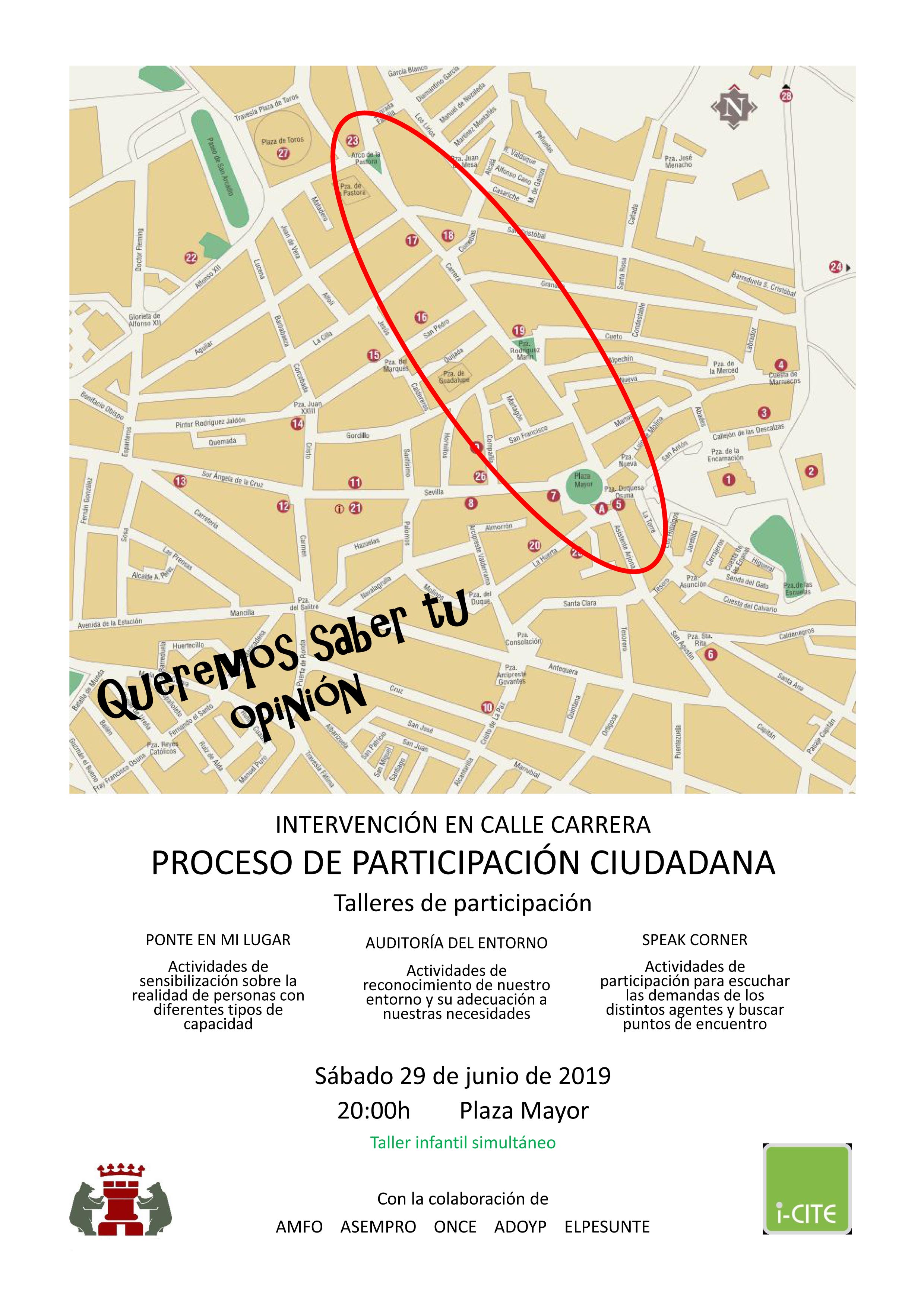 Desde el Ayuntamiento de Osuna se ha abierto el proceso de participación ciudadana para que los vecinos y vecinas de la localidad tengan la opción de aportar todo tipo sugerencias e ideas que se puedan incorporar al proyecto definitivo de mejora de la peatonalización y tráfico rodado de la calle Carrera que se pretende llevar a cabo en varias fases.