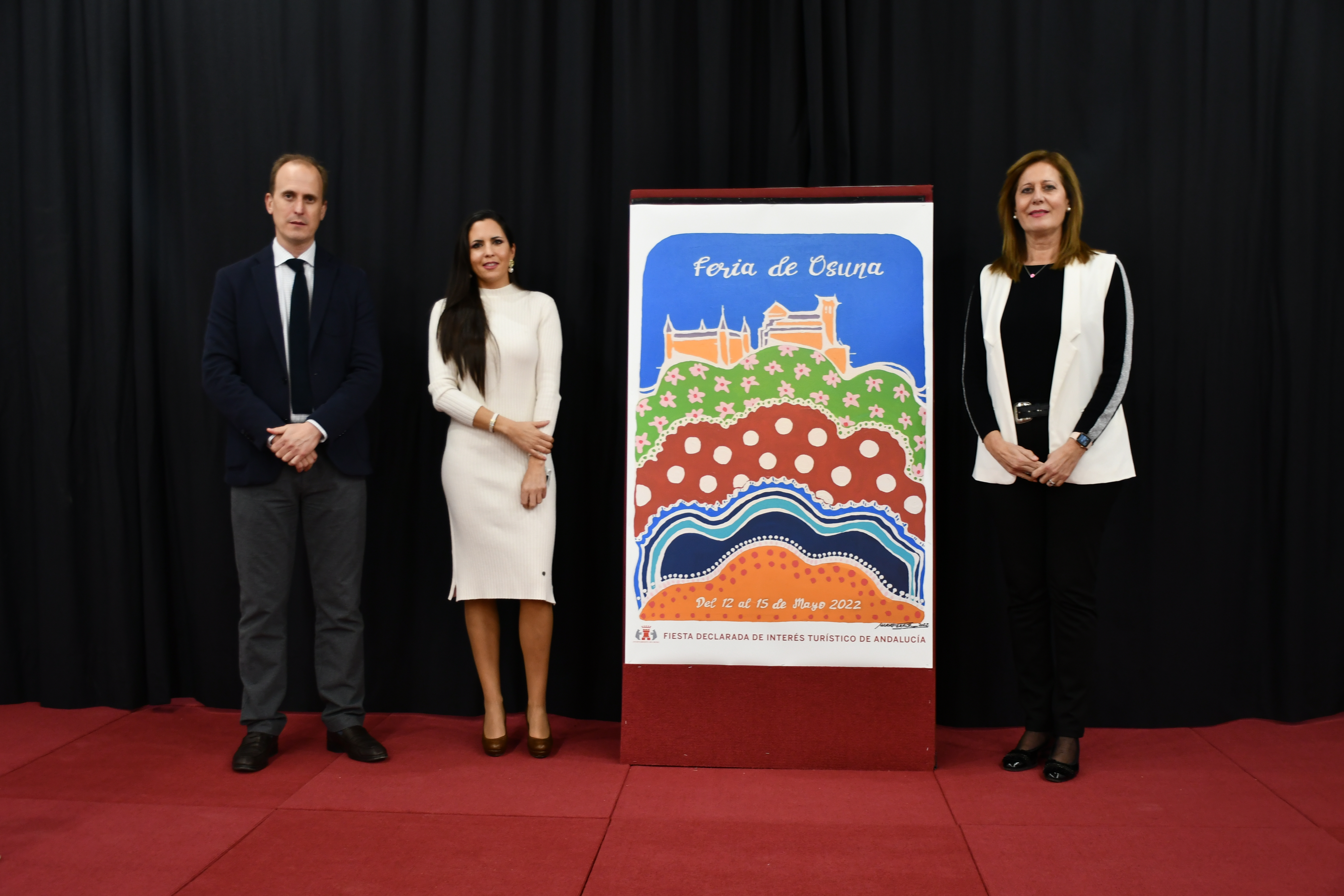 La alcaldesa de Osuna, acompañada por el delegado municipal de Festejos, Manuel Rodríguez, y por la autora del cartel ganador del concurso, María Ferrón, ha descubierto el cartel anunciador de la Feria de Osuna que se celebrará del 12 al 15 de mayo, tras dos años sin poder disfrutarla como consecuencia de la pandemia.