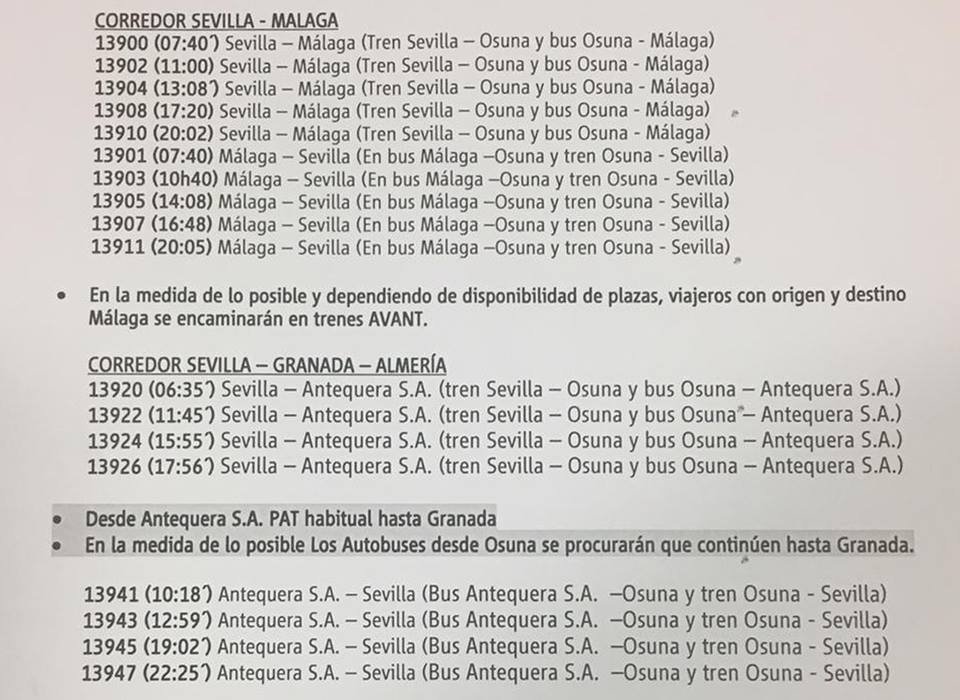 Restablecido el servicio ferroviario Osuna –Sevilla, el gerente de Renfe en Andalucía ha informado que se sigue trabajando por ir recuperando todos los tramos afectados por las lluvias, por lo que, a medida que se vayan reparando, el trayecto en tren se irá ampliando y reduciéndose la necesidad del uso del autobús como transporte alternativo.