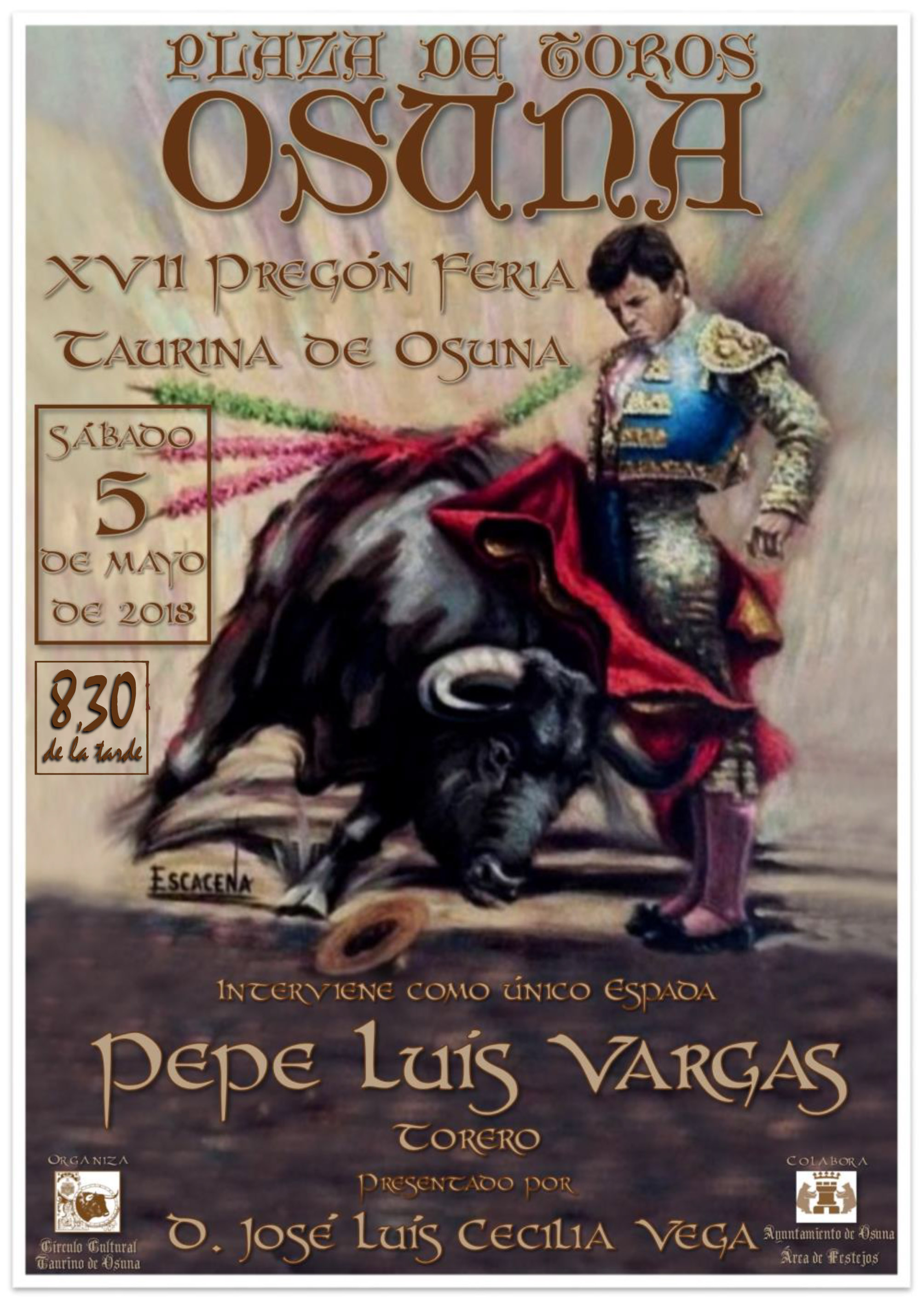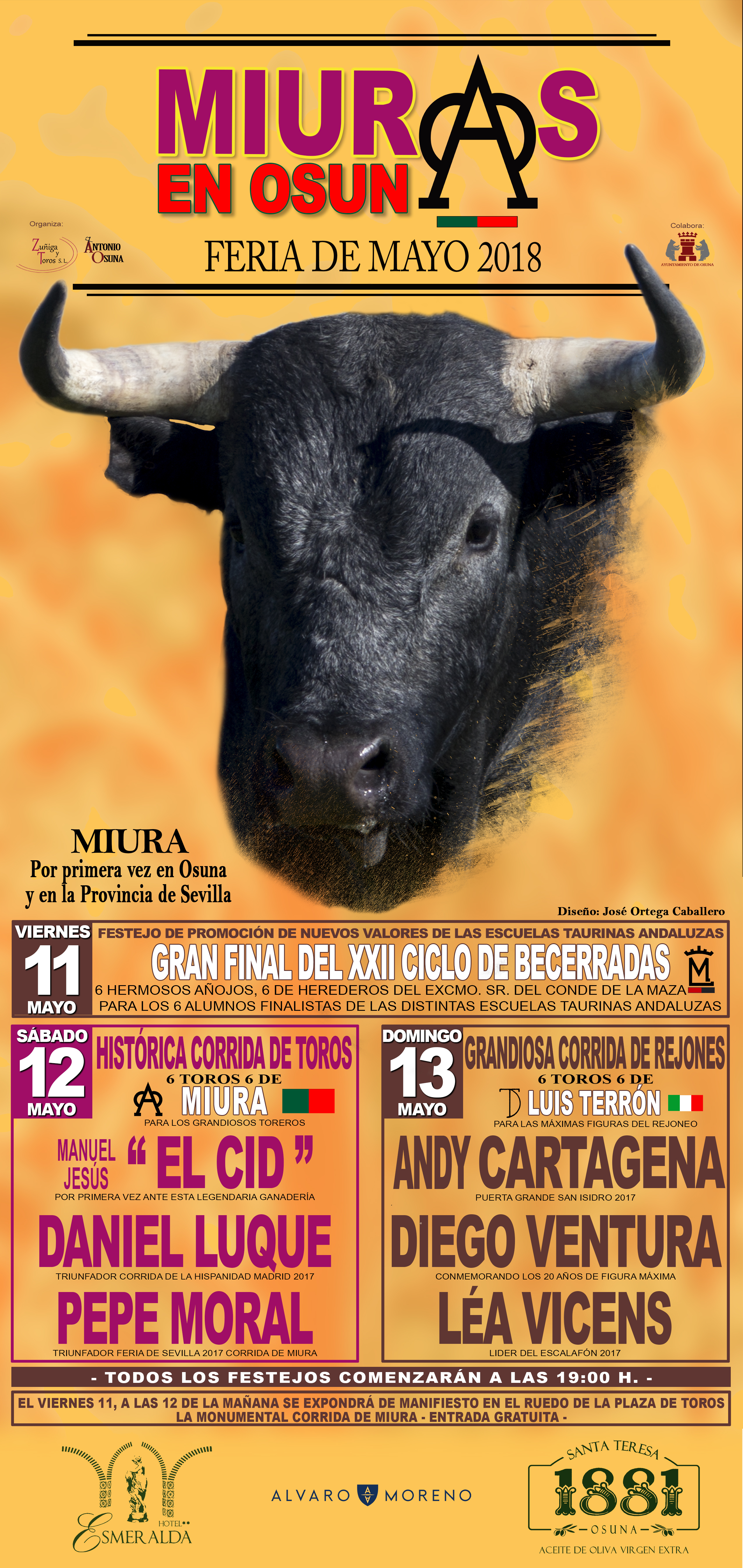 Así ha sido y este año no sólo no podía ser menos, sino que se ha ido a más, consiguiendo un hecho histórico como es que, por primera vez, se vea en el centenario coso taurino de Osuna una corrida de miuras, que lidiarán el sábado de feria los diestros Manuel Jesús «El Cid», Daniel Luque y Pepe Moral, y que, salvo en Sevilla, nunca se han lidiado toros de esta ganadería en la provincia. El domingo será el rejoneo con la presencia de Andy Cartagena, Diego Ventura y Léa Vicens, si bien, antes, el viernes, se celebra la final andaluza del ciclo de becerradas.